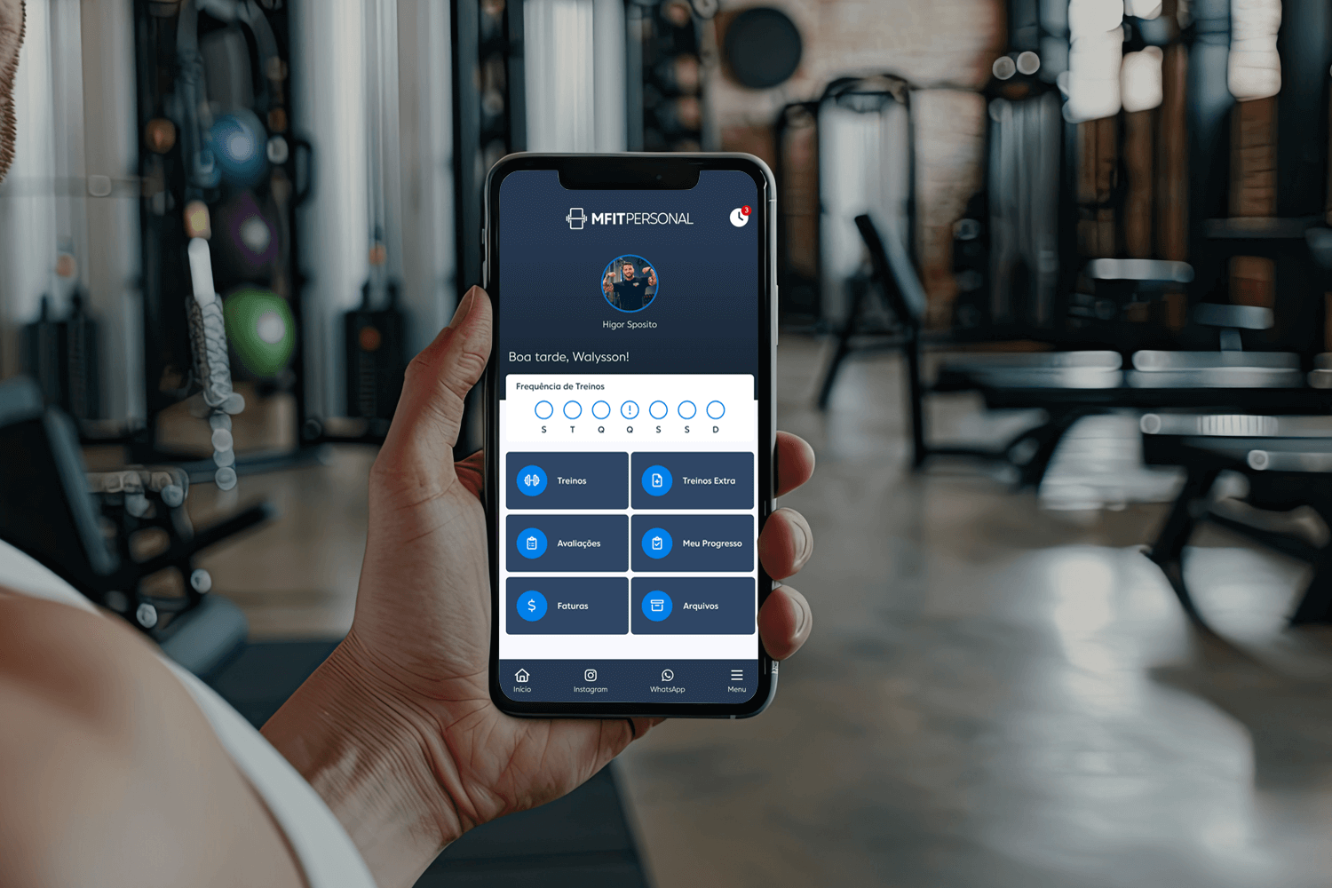 Seu progresso é registrado no aplicativo exclusivo, onde você acompanha sua evolução, faz ajustes e mantém a motivação para continuar avançando rumo ao seu objetivo.